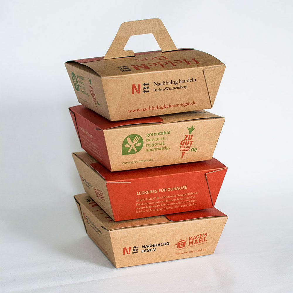 Die HeldeN!-Box knüpft im Rahmen der Nachhaltigkeitsstrategie Baden-Württemberg an die Gemeinschaftsaktion Restslos genießen. der Initiative „Zu gut für die Tonne!“ des Bundesministeriums für Ernährung und Landwirtschaft und Greentable, der PLattform für nachhaltige Gastronomie, an. Die Box fasst 1 350 ml Inhalt und ist aus FSC-zertifizierten Karton in der EU hergestellt. Eine spezielle Bioplastik-Beschichtung auf Wasserbasis macht die Box wasser- und fettresistent. Für die Bedruckung werden Farben auf Wasserbasis verwendet. Die HeldeN!-Box ist zu 100 % biologisch abbaubar und kompostierbar, lebensmittelecht und geruchlos. Sie verträgt Hitze bis 160 °C, kann in der Mikrowelle verwendet oder im Gefrierschrank gelagert werden. Gastronomiebetriebe können sie über den HeldeN!-Shop bestellen. Bei den jährlichen Nachhaltigkeitstagen findet die HeldeN!-Box Einsatz bei bestimmten Aktionen.