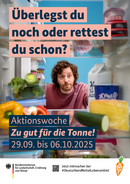 Unsere Beiträge zum Thema: Suche Finden Ähnliche Beiträge 393 Treffer: Rindfleisch Tipps und Fakten rund um die richtige Lagerung, Verwertung und Haltbarkeit von Rindfleisch finden Sie hier. mehr Link öffnen Hackfleisch Tipps und Fakten rund um die richtige Lagerung, Verwertung und Haltbarkeit von Hackfleisch finden Sie hier. mehr Link öffnen Geflügel Tipps und Fakten rund um die richtige Lagerung, Verwertung und Haltbarkeit von Geflügel finden Sie hier. mehr Link öffnen Newsletter Bitte geben Sie Ihre E-Mail-Adresse ein, um sich anzumelden. E-Mail* Anmelden … mehr Link öffnen Lebensmittelabfälle in Zahlen Lebensmittelabfälle nach Sektoren Im Jahr 2022 wurden in Deutschland rund 10,8 Millionen Tonnen Lebensmittelabfälle entsorgt. Dazu zählen neben übrig gebliebenen Speiseresten oder nicht verkauften… mehr Link öffnen Lebensmittel A-Z Das Lebensmittel-Lexikon gibt Tipps zur richtigen Lebensmittellagerung. Außerdem informieren wir über die Haltbarkeit von Lebensmitteln sowie geben weitere hilfreiche Ratschläge, um… mehr Link öffnen Informationsmaterialien Auf dieser Seite finden Sie Produkte wie Broschüren und Poster zur Voransicht, zum Ausdrucken oder Bestellen. Bitte beachten Sie die Nutzungshinweise. Material bestellen Die Materialien können… mehr Link öffnen Materialien Die Materialien können Sie sich einfach herunterladen und je nach Bedarf und Zweck für Ihre Online-Kommunikation verwenden, selbst ausdrucken oder in einer Druckerei anfertigen lassen. Es ist nicht… mehr Link öffnen 25_BMEL_0097_ZGFDT-2025_Aktionswoche_Plakat_210x297_barrierefrei_WEB.pdf mehr Link öffnen 25_BMEL_0097_ZGFDT-2025_Aktionswoche_Plakat_297x420_barrierefrei_WEB.pdf mehr Link öffnen Suchergebnisse 151 bis 160 von 393 «<11121314151617181920>»