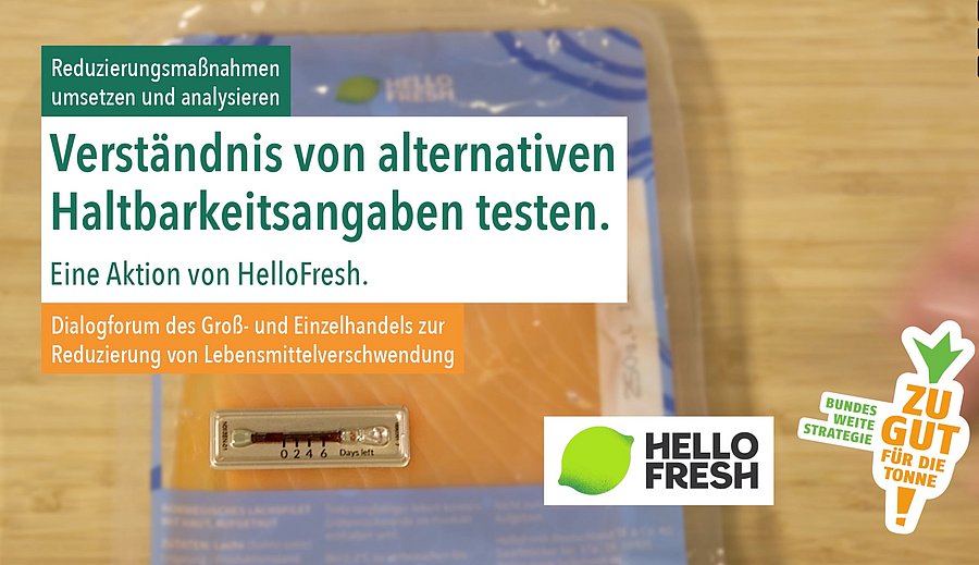 HelloFresh untersucht in diesem Projekt das Potential von alternativen Haltbarkeitsangaben zur Reduzierung von Lebensmittelverschwendung in privaten Haushalten. Dazu beteiliten sich 1.589 Kund:innen an einer Umfrage zum Verständnis eines Zeit-Temperatur-Indikators auf einer Lachsverpackung und daraus resultierenden möglichen Verhaltensänderungen. Das kurze Video erläutert Hintergründe, Ziele und Umsetzung des Demonstrationsprojekts im Rahmen des Dialogforums Groß- und Einzelhandel.