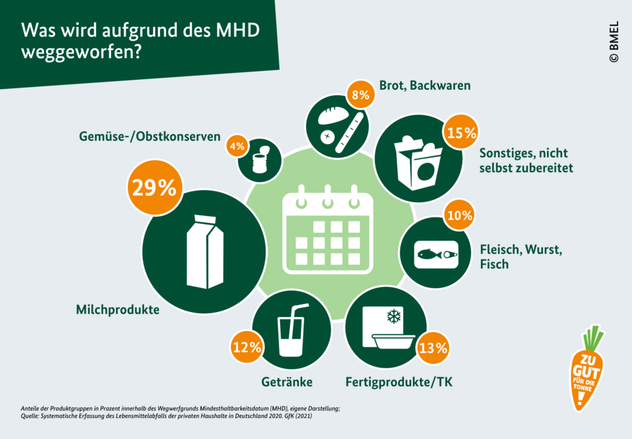Bevor ein Lebensmittel in der Tonne landet, sollte überprüft werden, ob es wirklich verdorben ist. Das Mindesthaltbarkeits- und Verbrauchsdatum geben hierbei eine erste Orientierung. Das Mindesthaltbarkeitsdatum (MHD) ist eine Empfehlung des Herstellers. Bis zum angegebenen Datum garantiert dieser bei richtiger Lagerung die spezifischen Eigenschaften des ungeöffneten Produkts wie beispielsweise Geschmack, Farbe und Konsistenz. Mit Überschreiten des MHDs ist ein Lebensmittel also nicht automatisch schlecht. Verlassen Sie sich auf Ihre Sinne: Wenn ein Produkt gut aussieht, riecht und schmeckt, ist es meistens auch noch gut. Grundsätzlich gilt: Eine offene Packung lässt Sauerstoff, Feuchtigkeit und Mikroorganismen hinein. Geöffnete Lebensmittel können also schneller verderben. Auf den Verpackungen mancher Produkte finden sich daher auch Angaben darüber, wie lange diese nach Anbruch noch haltbar sind. Wichtig für die Haltbarkeit sind die richtige Aufbewahrung und der sachgemäße Transport – zum Beispiel vom Supermarkt nach Hause.